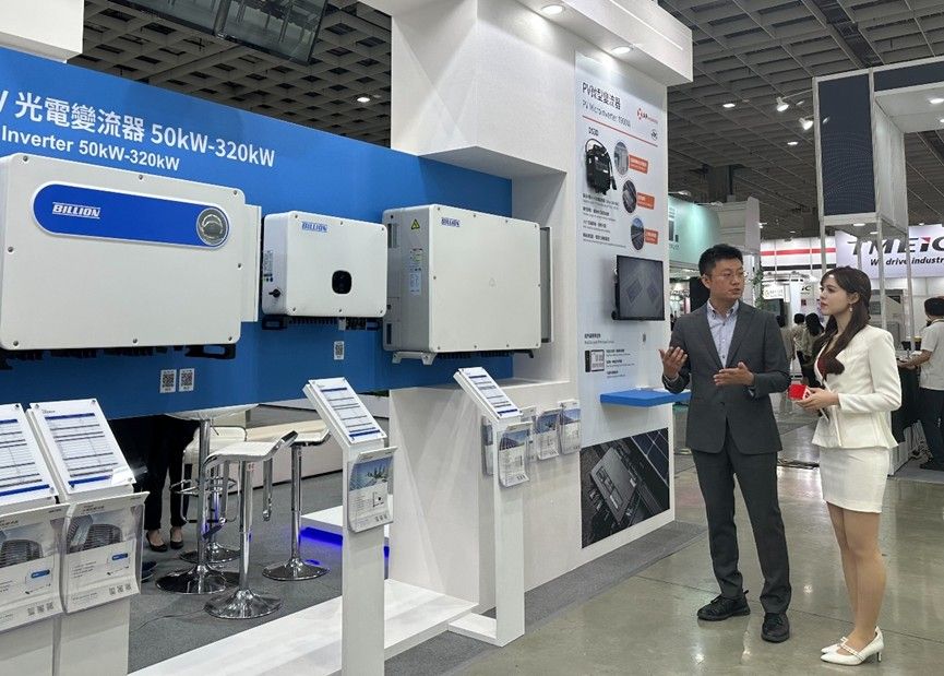 盛達電業Billion品牌多款高效能光電變流器,涵蓋 50kW 至 320kW 全系列產品,強調高轉換效率與智慧監控整合能力,獲現場業者高度關注。